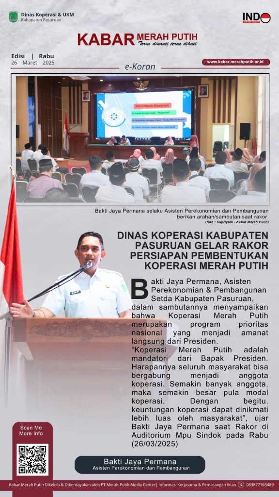 Bakti Jaya Permana, Asisten Perekonomian dan Pembangunan Setda Kabupaten Pasuruan, dalam sambutannya menyampaikan bahwa Koperasi Merah Putih merupakan program prioritas nasional yang menjadi amanat langsung dari Presiden.