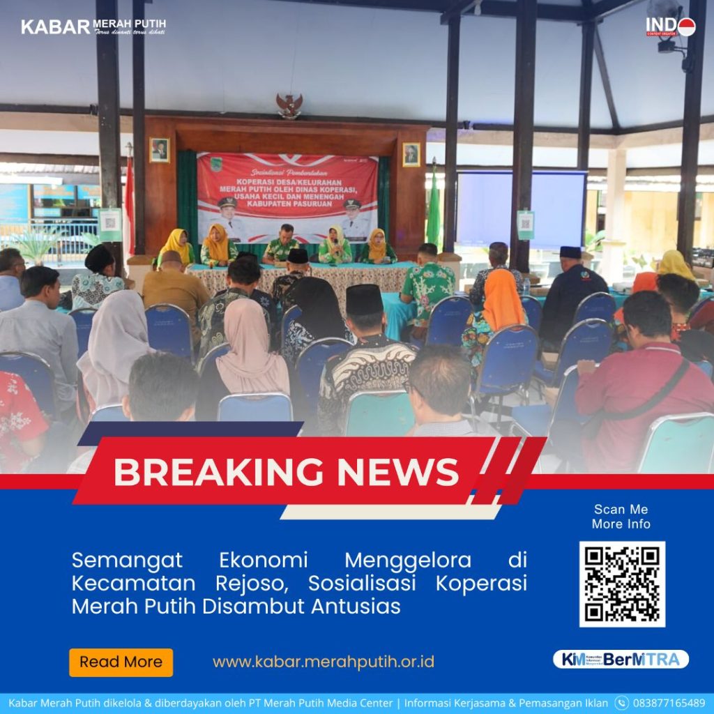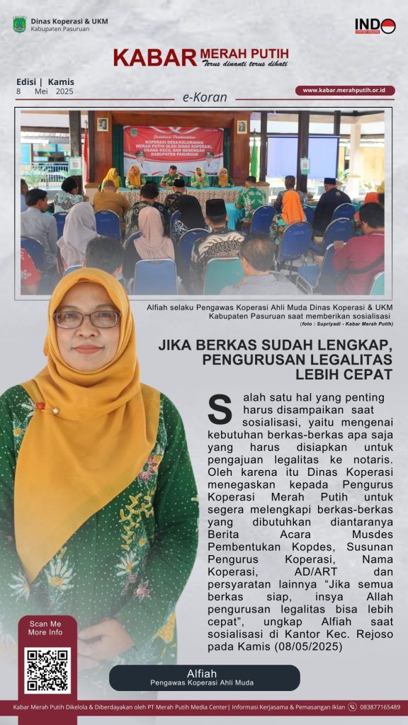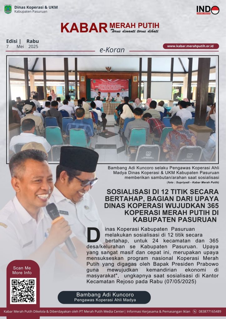 Pasuruan, 8 Mei 2025 – Gerakan nasional pemberdayaan ekonomi rakyat melalui koperasi terus digelorakan. Kali ini, Dinas Koperasi dan UKM Kabupaten Pasuruan melanjutkan rangkaian Sosialisasi Pembentukan Koperasi Desa/Kelurahan Merah Putih, yang digelar di Kantor Kecamatan Rejoso, Rabu–Kamis, 7–8 Mei 2025.