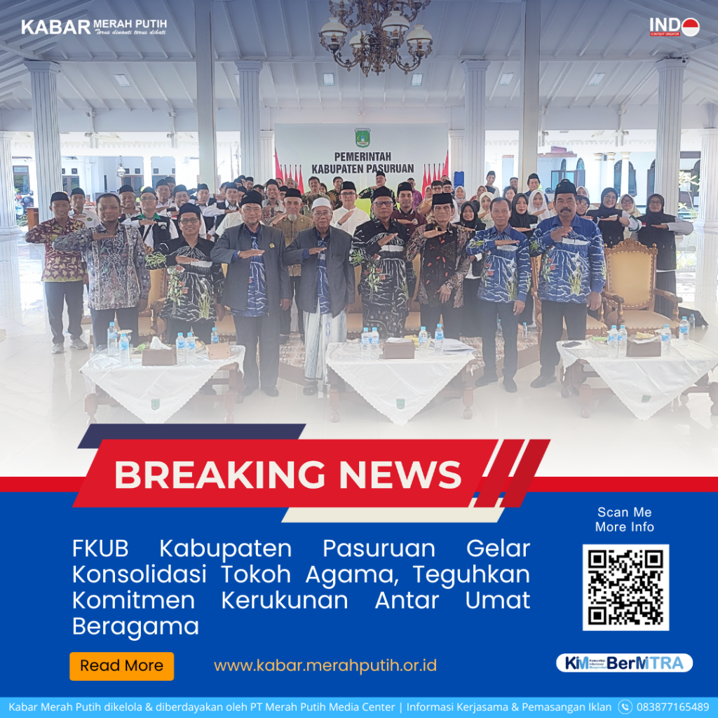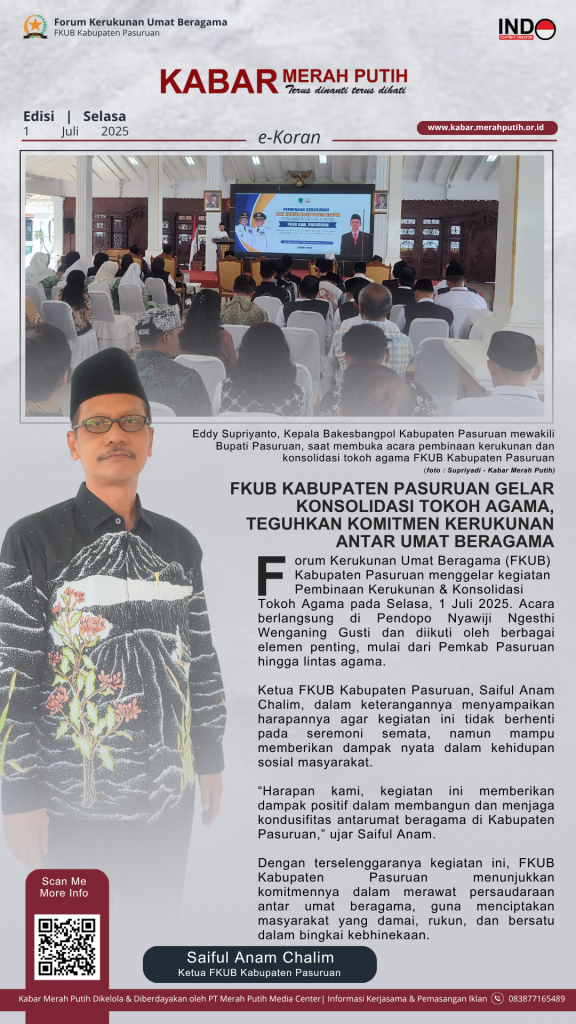 Pasuruan – Forum Kerukunan Umat Beragama (FKUB) Kabupaten Pasuruan menggelar kegiatan Pembinaan Kerukunan & Konsolidasi Tokoh Agama pada Selasa, 1 Juli 2025. Acara berlangsung di Pendopo Nyawiji Ngesthi Wenganing Gusti dan diikuti oleh berbagai elemen penting mulai dari Pemkab Pasuruan hingga lintas agama.